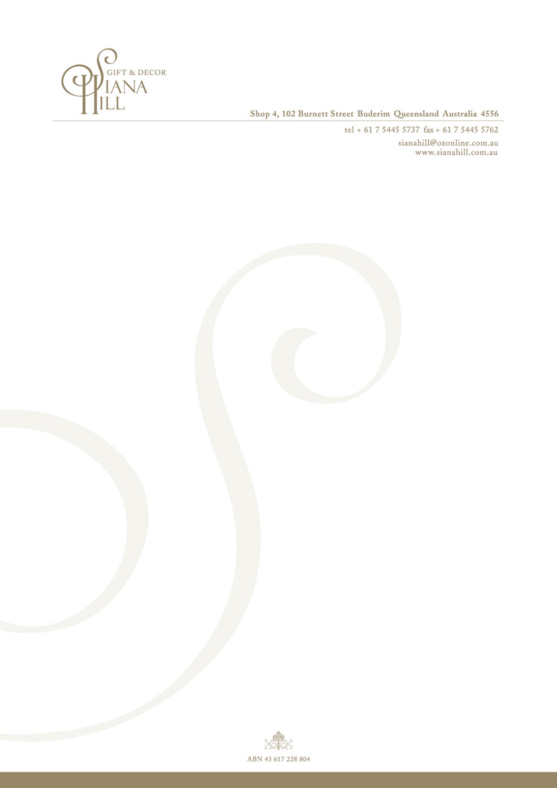 The business required a full suite of graphic collateral including; logo, letterhead, business cards, signage, advertising templates and photography for publicity material. The result was an upmarket brand identity that secured Siana Hill as a go-to location for fine gifts and furnishings.