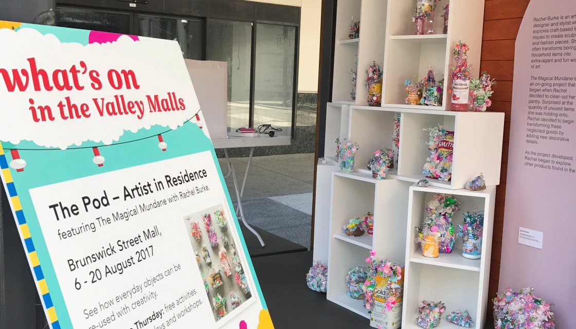 During August 2017 Engage Arts collaborated with the fabulous artist, designer and stylist Rachel Burke to bedazzle The Pod in Brunswick St Mall with her on-going craft project, The Magical Mundane. Armed with sequins, jewels and glitter, The Magical Mundane for Brisbane City Council’s artist-in-residence at The Pod brought together an exhibition and diverse workshops and events that invited participants to join Rachel in turning mundane household objects into glittering works of art. On a sunny Sunday afternoon, around 40 visitors enjoyed taking snaps of the exhibition while chatting to Rachel as… Read More